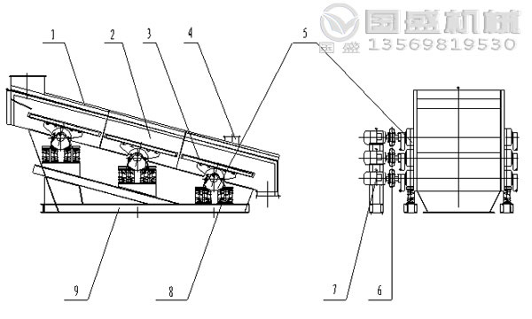 1.密封罩  2.篩箱  3.篩板  4.除塵口  5.激振器  6.軟連接裝置       7.電動(dòng)機(jī)  8.減振彈簧  9.底托